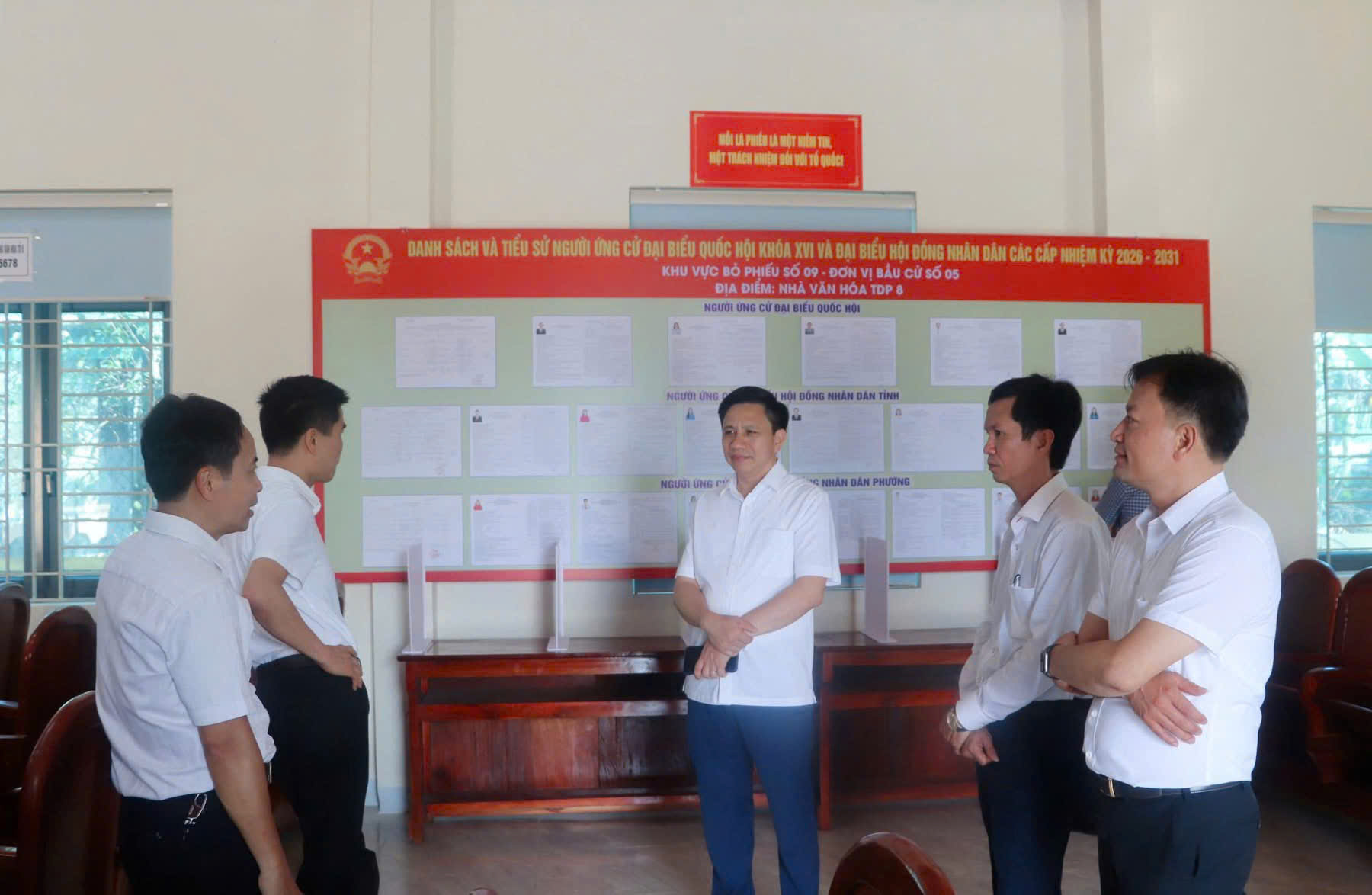 Đoàn đã đến một số Khu vực bỏ phiếu trên địa bàn các phường, xã để kiểm tra việc lập danh sách cử tri sau thời gian niêm yết công khai; niêm yết danh sách trích ngang và tiểu sử tóm tắt những người ứng cử đại biểu Quốc hội khóa XVI và đại biểu HĐND các cấp nhiệm kỳ 2026-2031; công tác thông tin, tuyên truyền về bầu cử; việc trang trí, khánh tiết bên ngoài khu vực bỏ phiếu.