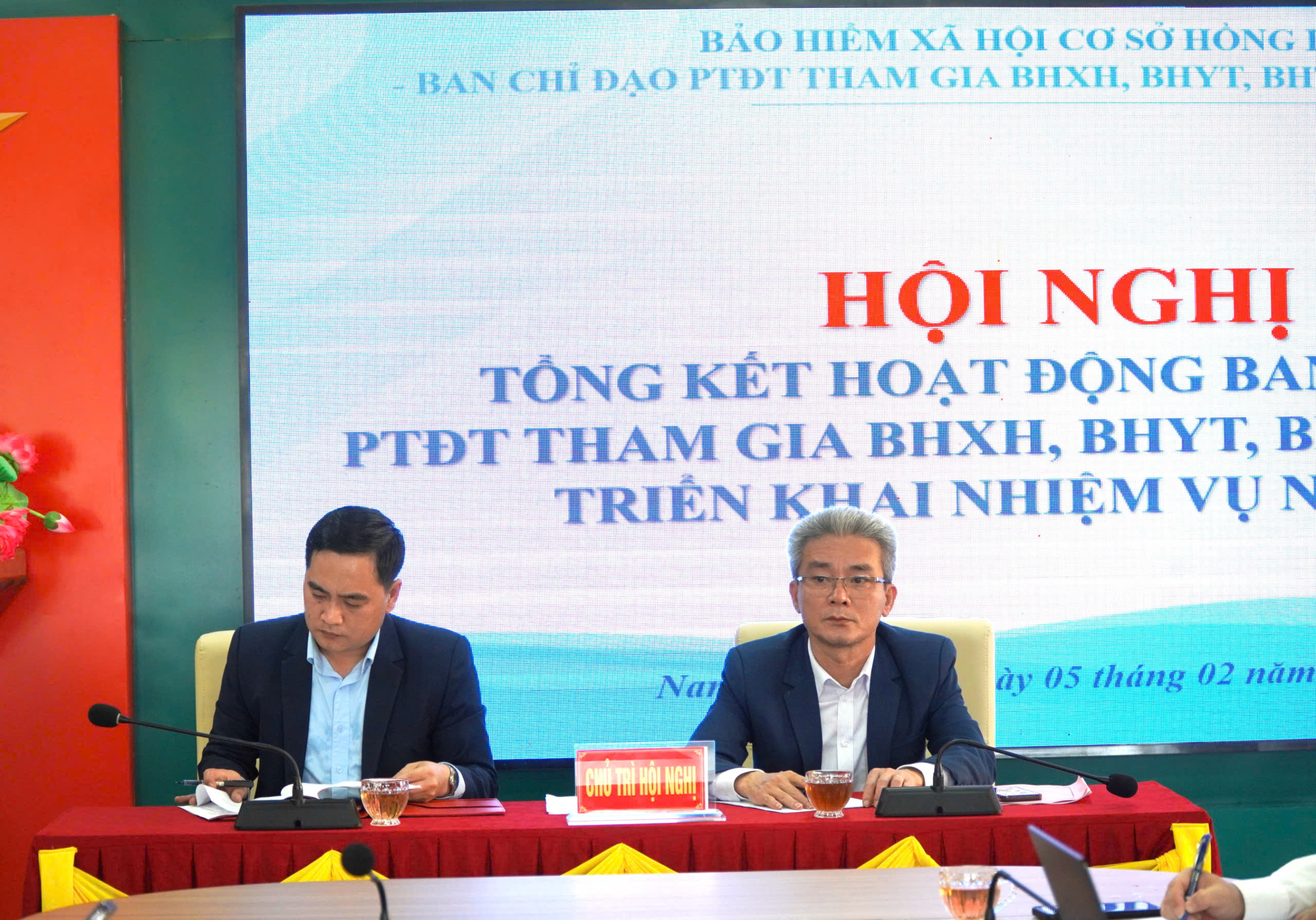 Các đồng chí Hồ Văn Phong - Giám đốc BHXH cơ sở Hồng Lĩnh và đồng chí Bùi Việt Hưng, Phó Giám đốc BHXH cơ sở Hồng Lĩnh chủ trì hội nghị.