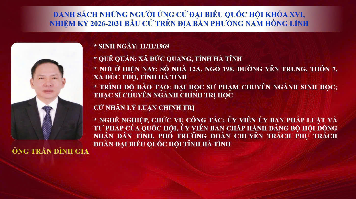 - Nghề nghiệp, chức vụ công tác: Ủy viên Ủy ban Pháp luật và Tư pháp của Quốc hội; Ủy viên Ban Chấp hành Đảng bộ Hội đồng nhân dân tỉnh; Phó Trưởng đoàn chuyên trách phụ trách Đoàn đại biểu Quốc hội tỉnh Hà Tĩnh