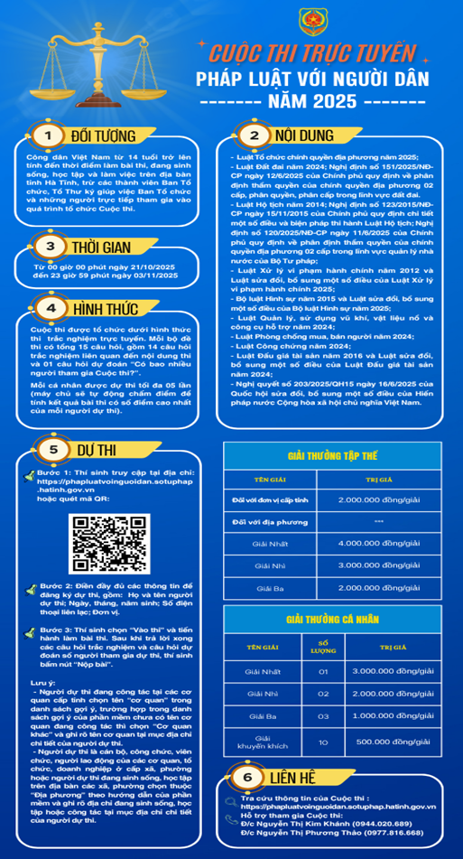 Cuộc thi được tổ chức dưới hình thức trắc nghiệm trực tuyến tại địa chỉ: https://phapluatvoinguoidan.sotuphap.hatinh.gov.vn