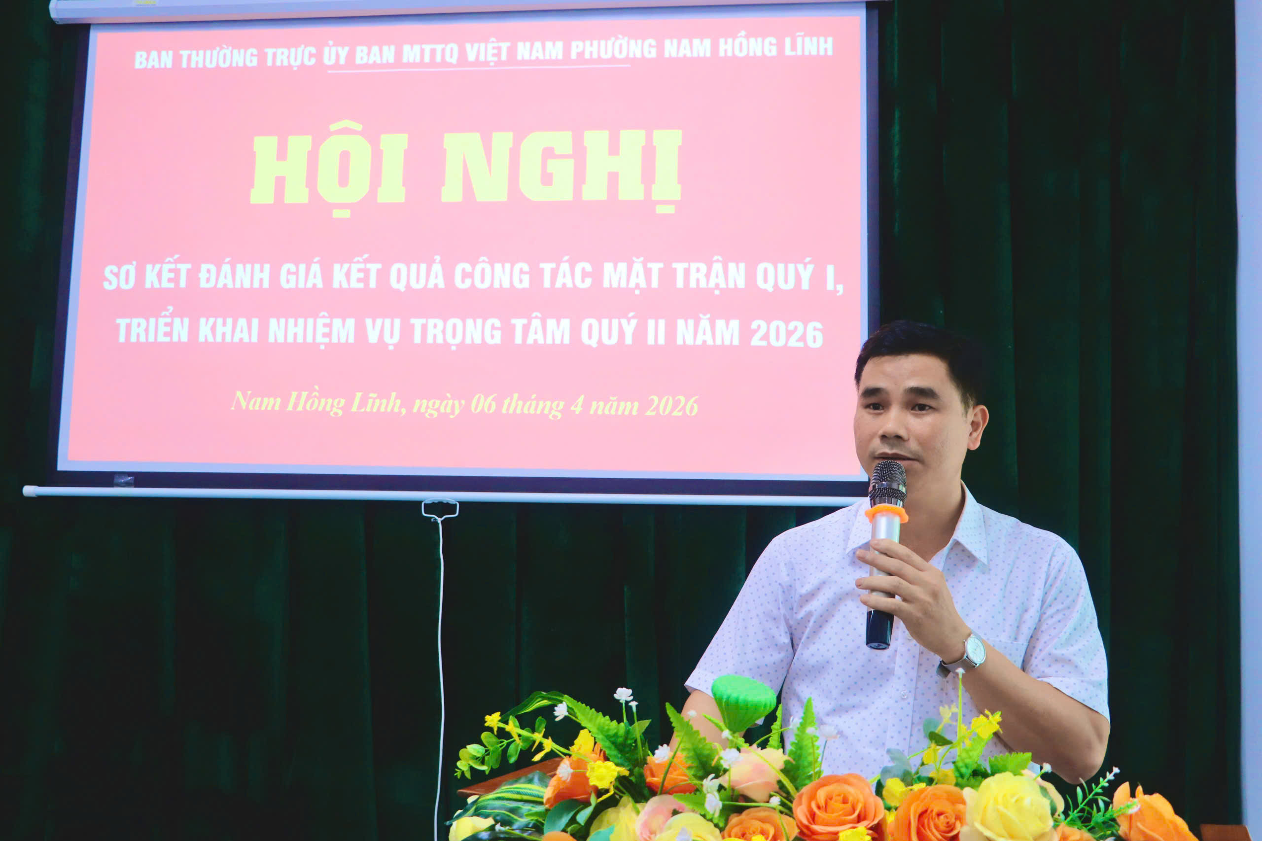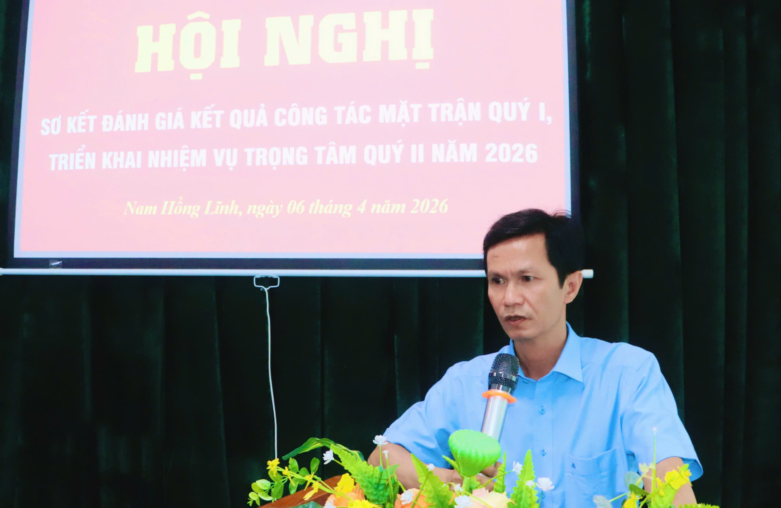 Đồng chí Lê Văn Trình, Phó Chủ tịch Ủy ban MTTQ báo cáo sơ kết đánh giá tình hình công tác Mặt trận quý I, triển khai nhiệm vụ trọng tâm quý II năm 2026