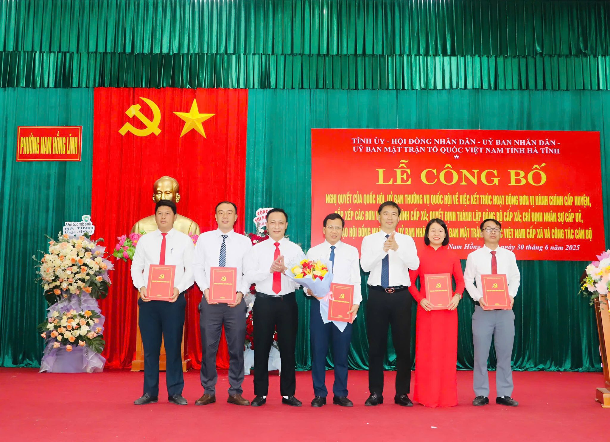 Tại điểm cầu của Tỉnh, Lãnh đạo Tỉnh đã trao Quyết định của BTV Tỉnh ủy về thành lập 69 đảng bộ xã, phường là đảng bộ cấp trên trực tiếp của tổ chức cơ sở đảng, trực thuộc Tỉnh ủy Hà Tĩnh kể từ ngày 1/7/2025. Trong đó, trao quyết định thành lập Đảng bộ Nam Hồng Lĩnh đồng chí Nguyễn Hữu Khiếu, Bí thư Đảng ủy, Chủ tịch HĐND phường.