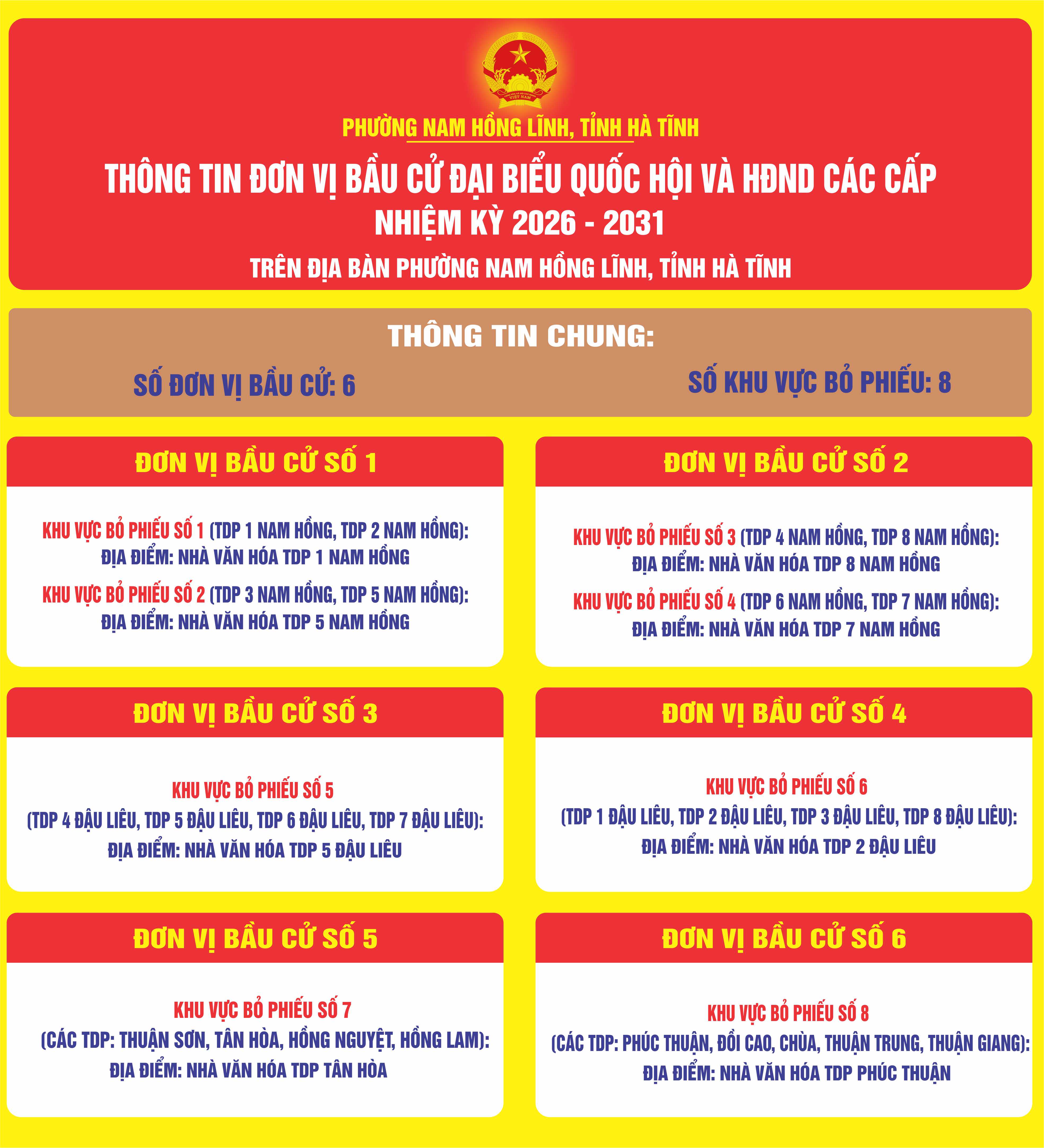 Thực hiện công tác chuẩn bị cho bầu cử đại biểu Quốc hội khóa XVI và đại biểu Hội đồng nhân dân các cấp, nhiệm kỳ 2026–2031, UBND phường Nam Hồng Lĩnh đã hoàn thành việc phân chia 8 khu vực bỏ phiếu trên địa bàn. Việc sắp xếp các khu vực bỏ phiếu được thực hiện phù hợp với đặc điểm dân cư từng tổ dân phố, bảo đảm thuận lợi cho Nhân dân tham gia bầu cử, góp phần tổ chức ngày bầu cử diễn ra dân chủ, văn minh, đúng quy định./.