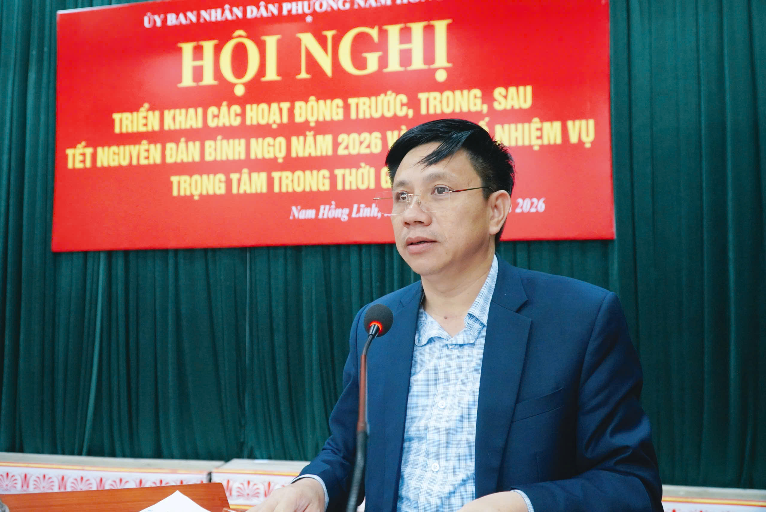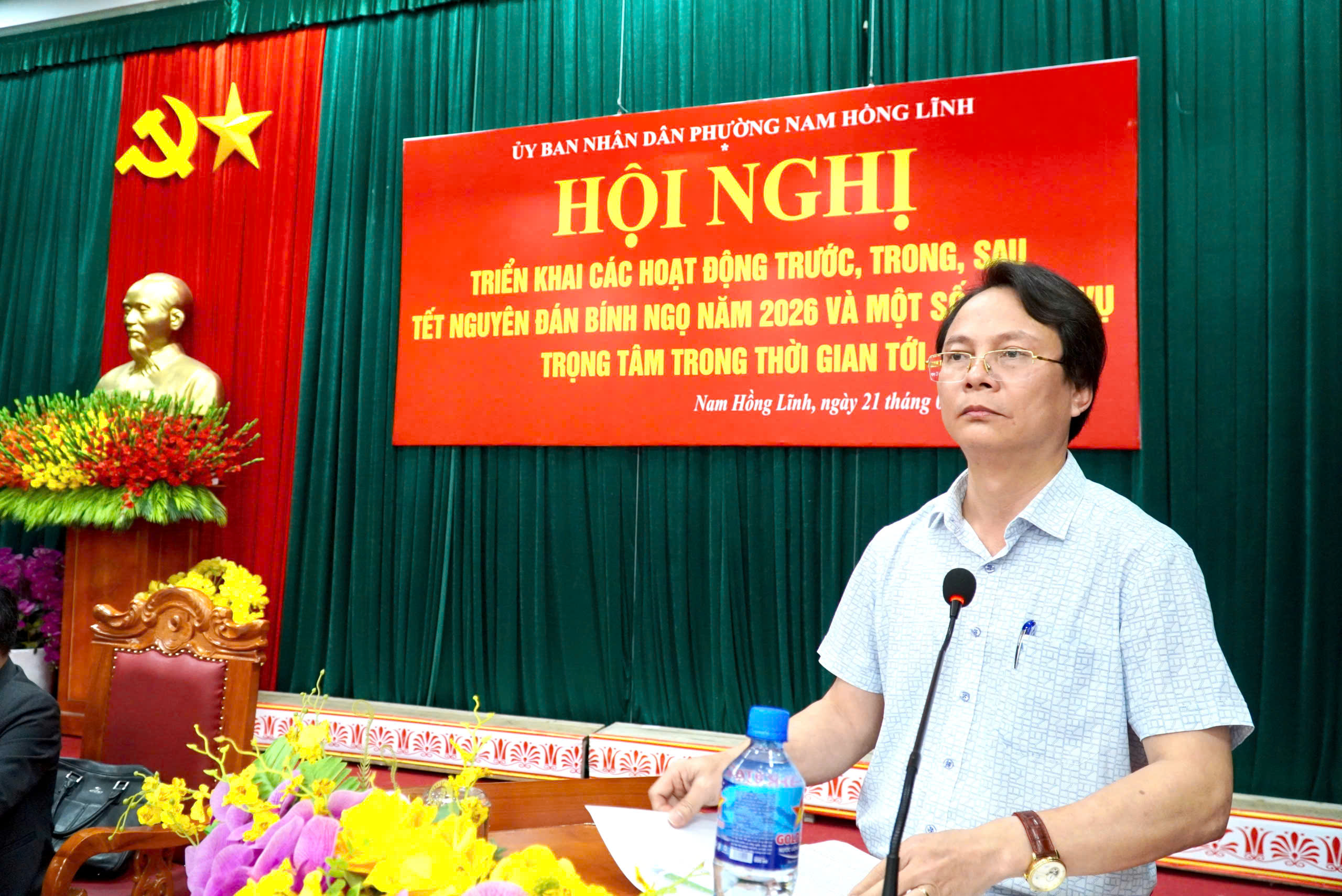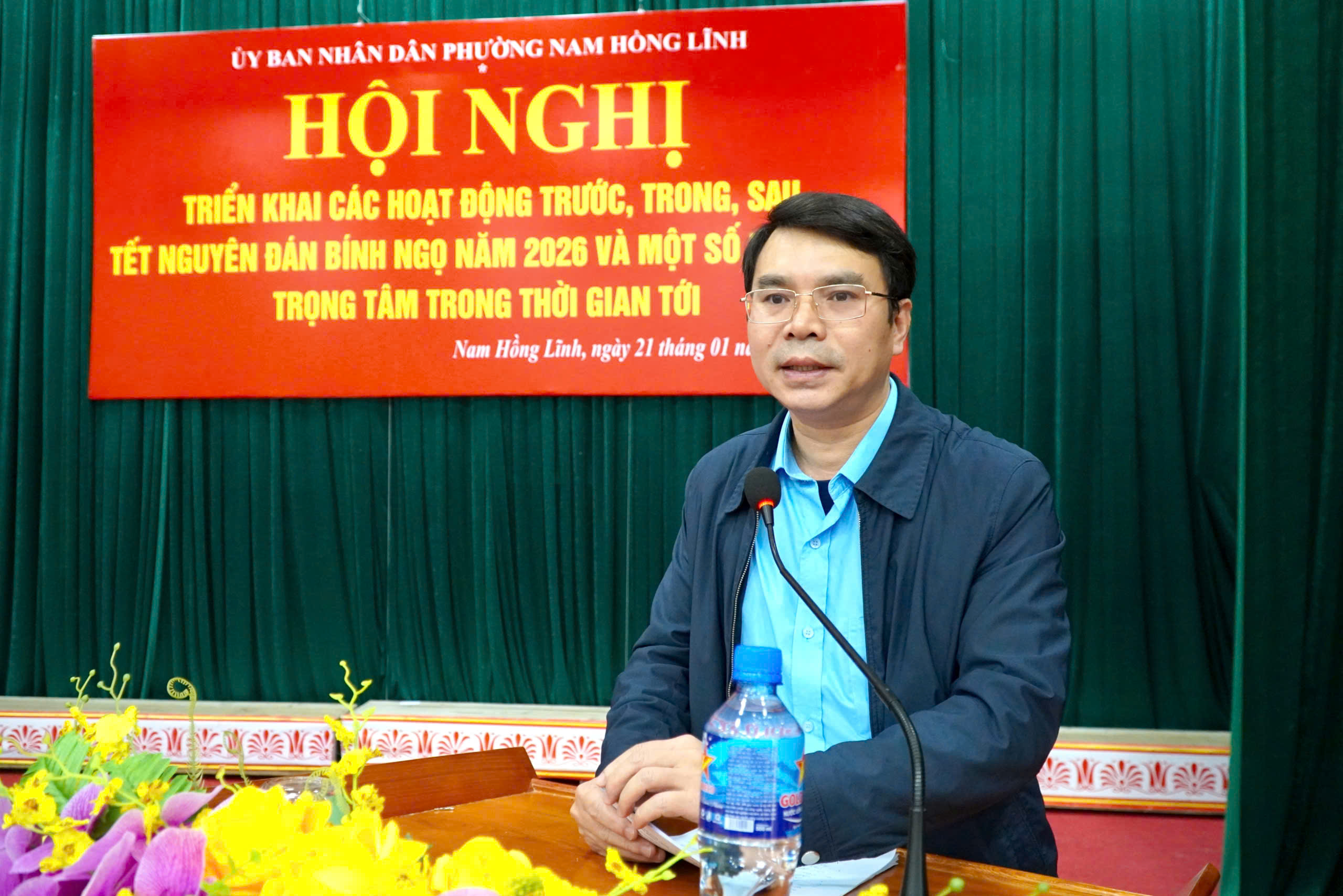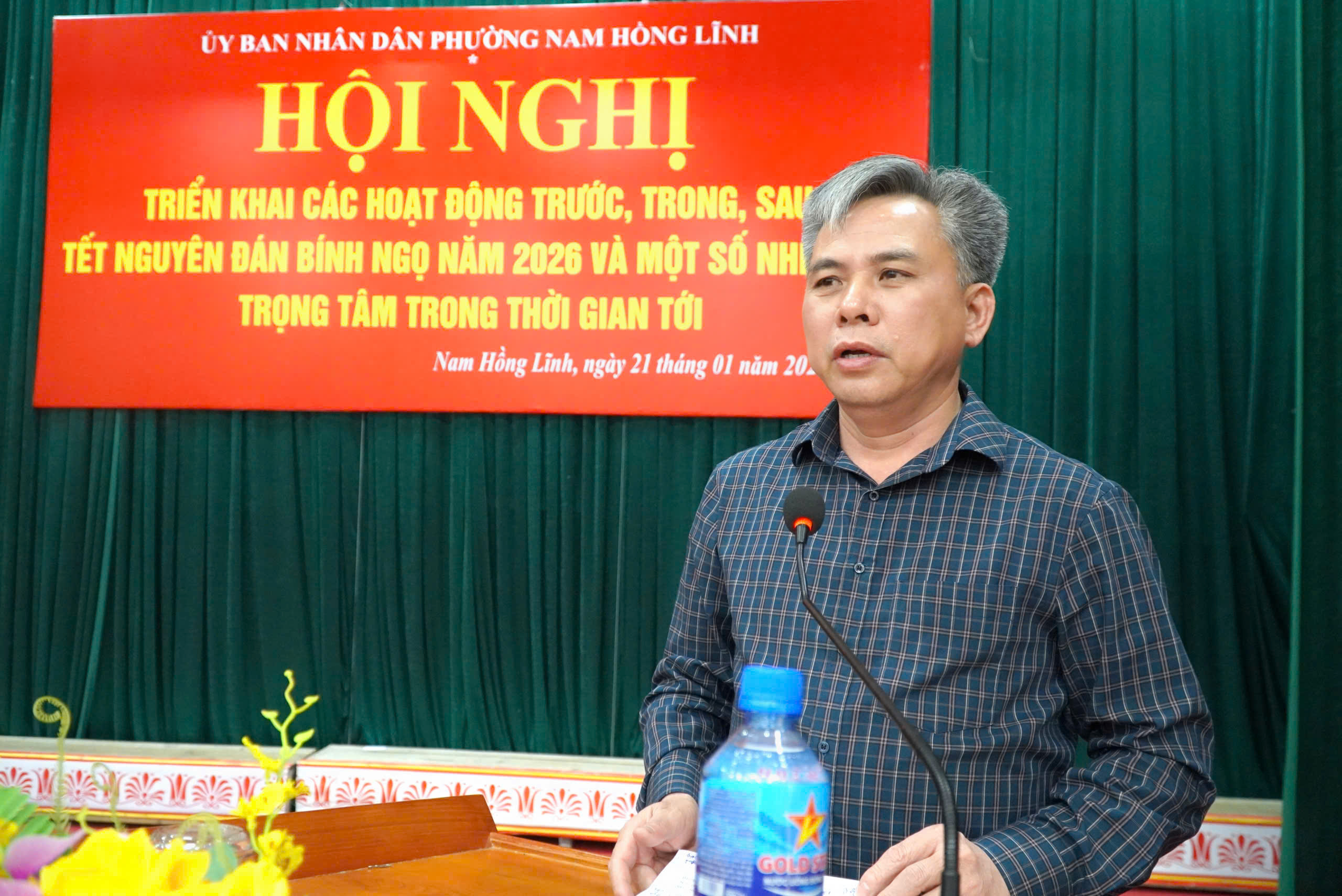 Phát biểu chỉ đạo tại hội nghị, đồng chí Nguyễn Hữu Khiếu, Ủy viên BCH Đảng bộ tỉnh, Bí thư Đảng ủy, Chủ tịch HĐND phường đề nghị: Các cơ quan, đơn vị, đặc biệt là các phòng, ban UBND cần bám sát kế hoạch khung năm 2026 để tập trung triển khai quyết liệt các mục tiêu, chỉ tiêu, nhiệm vụ phát triển kinh tế - xã hội ngay từ những ngày đầu của năm; Tập trung đẩy mạnh công tác tuyên truyền gắn với nhiều hoạt động chính trị; thực hiện tốt các chính sách về an sinh xã hội, chăm lo đời sống vật chất, tinh thần cho các gia đình người có công, gia đình chính sách, người có hoàn cảnh khó khăn. Tổ chức thăm hỏi, tặng quà cho các đối tượng theo quy định; Phát động đợt thi đua cao điểm trong các cơ quan, đơn vị, tổ dân phố về chỉnh trang đô thị, trang trí ánh sáng đô thị, vệ sinh môi trường để các tuyến đường, ngõ phố được sạch đẹp tạo nên nét đẹp văn minh đô thị. UBND phường, lực lượng công an, quân sự phường cần tăng cường thực hiện các biện pháp phòng chống tội phạm, giữ gìn an ninh trật tự, an toàn xã hội trên địa bàn. Có biện pháp phòng ngừa, đấu tranh quyết liệt, hiệu quả đối với các loại tội phạm, hành vi vi phạm pháp luật. Triển khai nhiệm vụ tuần tra, kiểm soát, bảo đảm trật tự, an toàn giao thông; đẩy mạnh tuyên truyền, hướng dẫn về công tác phòng, cháy chữa cháy; Phối hợp với các ban, ngành thực hiện tốt công tác kiểm tra, kiểm soát thị trường, an toàn thực phẩm, bình ổn giá, cung ứng hàng hóa tiêu dùng cho nhân dân; đặc biệt không để xẩy ra hiện tượng găm hàng, khan hiếm hàng, tăng giá bán; kịp thời phát hiện, xử lý, báo cáo xử lý nghiêm các hành vi gian lận thương mại, sản xuất, kinh doanh hàng giả, hàng kém chất lượng; Nắm chắc số thanh niên đã trúng tuyển nghĩa vụ quân sự để tổ chức giao quân đảm bảo chỉ tiêu, an toàn tuyệt đối; Tập trung thực hiện tốt công tác bầu cử Đại biểu Quốc hội và HĐND các cấp nhiệm kỳ 2026-2031
