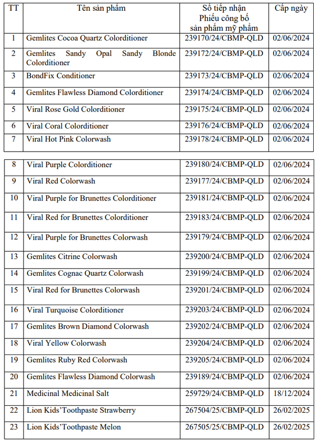 1. Thu hồi trên toàn quốc đối với 23 sản phẩm của Công ty TNHH Phát Anh Minh (Thanh Trì, Hà Nội). Trong số này có các loại dầu xả Gemlites Cocoa Quartz Colorditioner, BondFix Conditioner, Viral Rose Gold Colorditioner. Ngoài ra còn có kem đánh răng Lion Kids' Toothpaste Strawberry, Lion Kids'Toothpaste Melon, Viral Hot Pink Colorwash, Medicinal Salt...