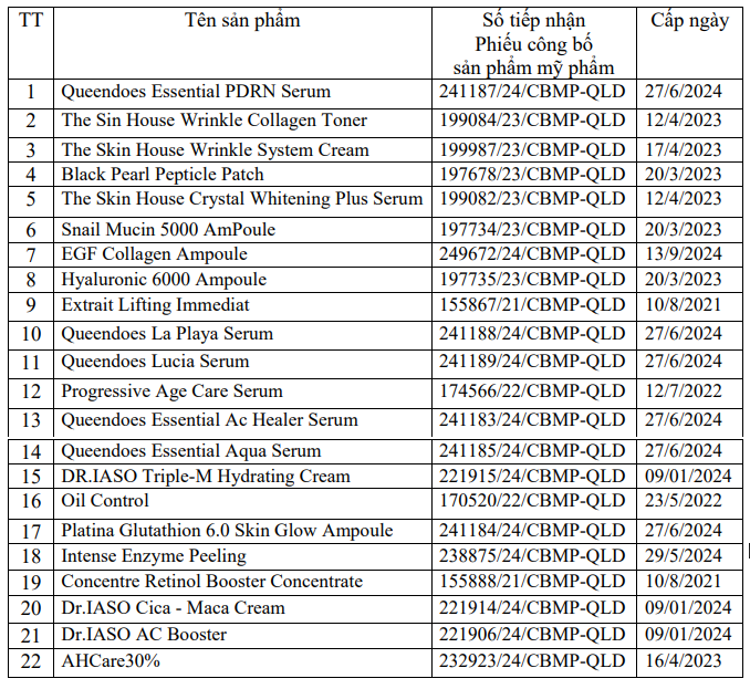 Trong số này có các sản phẩm: Queendoes Essential PDRN Serum, The Skin House Essential Wrinkle Collagen Toner, The Skin House Wrinkle System Cream, Black Pearl Peptide Patch, The Skin House Crystal Whitening Plus Serum, Snail Mucin 5000 Ampoule, EGF Collagen Ampoule, Hyaluronic 6000 Ampoule, Extrait Lifting Immediat, Queendoes La Playa Serum, Queendoes Lucia Serum, Progressive Age Care Serum, Queendoes Essential AC Healer Serum, Queendoes Essential Aqua Serum, DR.IASO Triple-M Hydrating Cream, Oil Control Cream, Platina Glutathion 6.0 Skin Glow Ampoule, Intense Enzyme Peeling, Concentre Retinol Booster Concentrate, Dr.IASO Cica-Maca Cream, Dr.IASO AC Booster, AHCare30%.