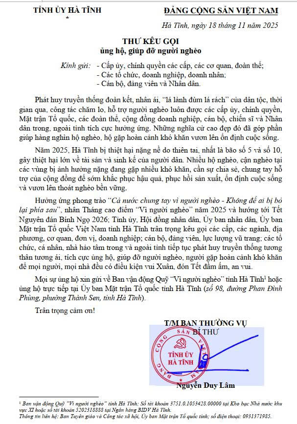 Hưởng ứng phong trào “Cả nước chung tay vì người nghèo - Không để ai bị bỏ lại phía sau”, nhân Tháng cao điểm “Vì người nghèo” năm 2025 và hướng tới Tết Nguyên đán Bính Ngọ 2026; Tỉnh ủy, Hội đồng nhân dân, Ủy ban nhân dân, Ủy ban Mặt trận Tổ quốc Việt Nam tỉnh Hà Tĩnh trân trọng kêu gọi các cấp, các ngành, địa phương, cơ quan, đơn vị, doanh nghiệp; cán bộ, đảng viên, lực lượng vũ trang; các tổ chức, cá nhân, nhà hảo tâm trong và ngoài tỉnh tiếp tục phát huy truyền thống tương thân tương ái, tích cực ủng hộ, giúp đỡ người nghèo, người gặp hoàn cảnh khó khăn
