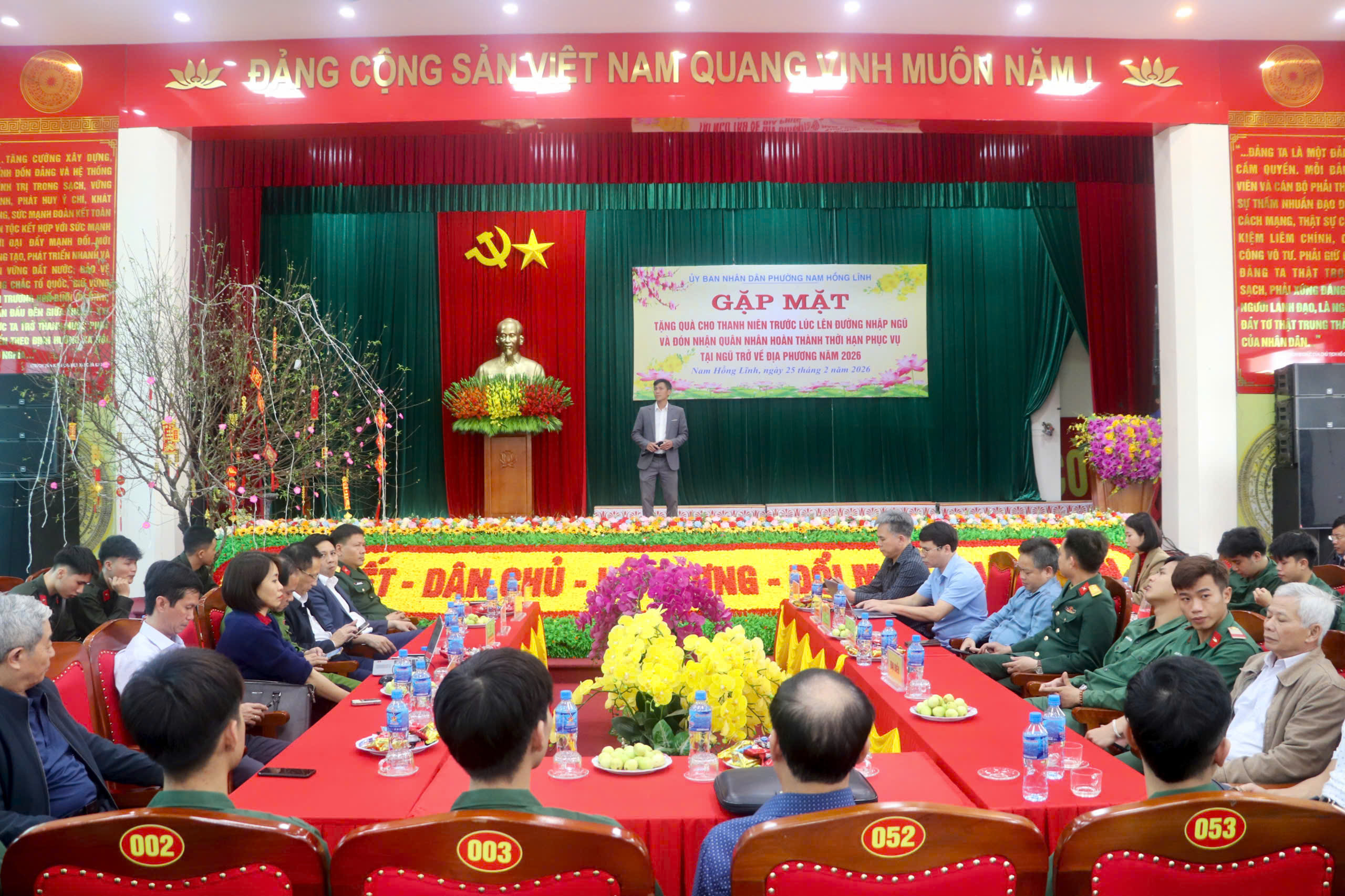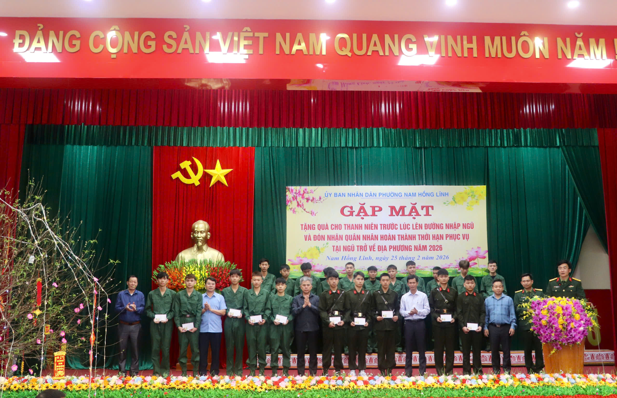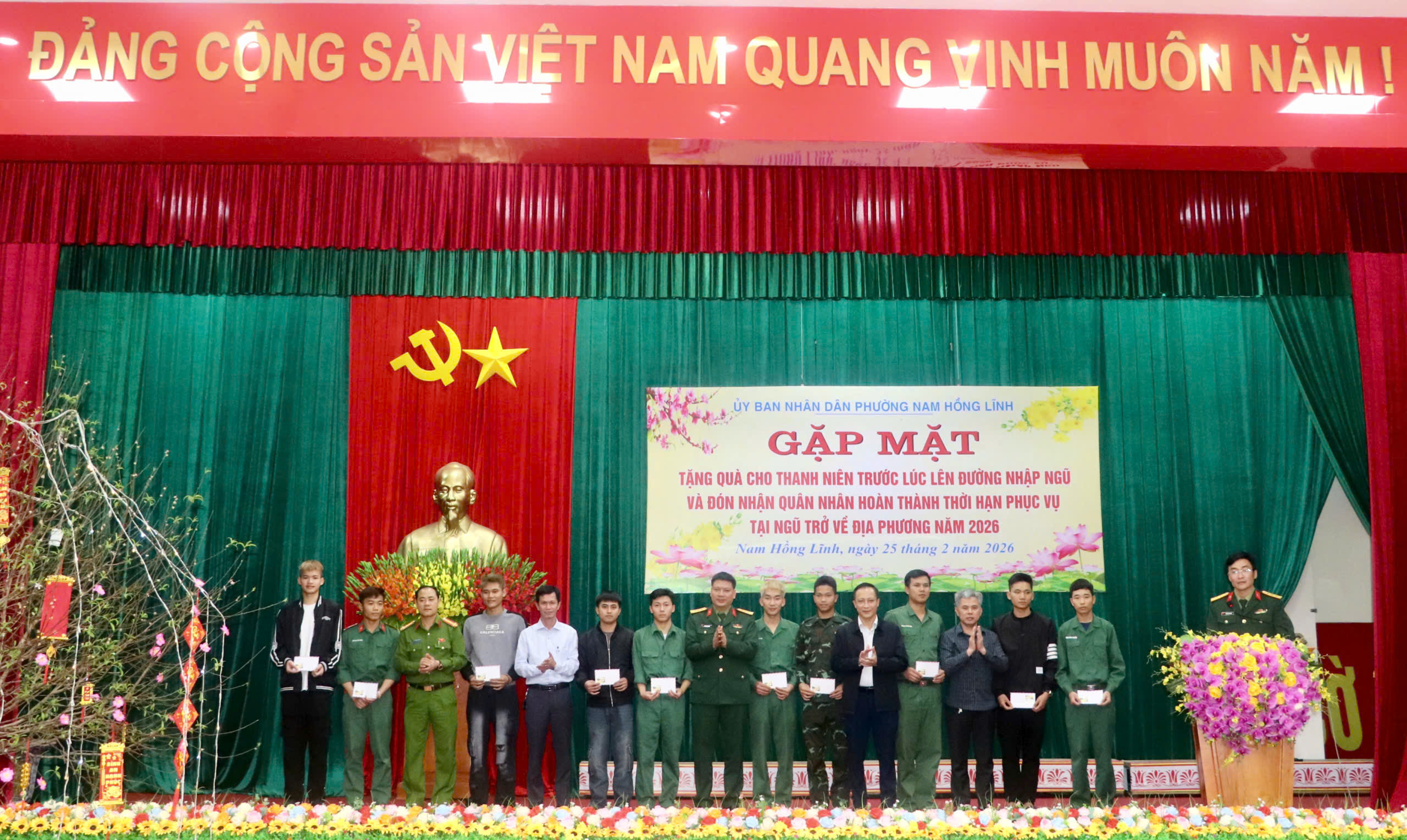 Tham dự buổi gặp mặt có Thượng tá Nguyễn Bá Khánh, Chỉ huy trưởng Ban chỉ huy phòng thủ khu vực 1 – Nam Hồng Lĩnh; đồng chí Nguyễn Hữu Khiếu – Ủy viên Ban Chấp hành Đảng bộ tỉnh, Bí thư Đảng ủy, Chủ tịch HĐND phường; đồng chí Hoàng Bá Khang – Phó Bí thư Thường trực Đảng ủy; đồng chí Tôn Quang Ngọc – Phó Bí thư Đảng ủy, Chủ tịch UBND phường, Chủ tịch HĐNVQS phường, cùng các đồng chí trong Ban Thường vụ, Ban Chấp hành Đảng bộ phường; Chủ tịch Uỷ ban MTTQ và Trưởng các đoàn thể phường; Thành viên hội đồng Nghĩa vụ quân sự phường; Bí thư, Tổ trưởng, Tổ đội trưởng các TDP có thanh niên trúng tuyển nghĩa vụ Quân sự và Công an nhân dân năm 2026; các quân nhân hoàn thành nghĩa vụ và 23 thanh niên chuẩn bị nhập ngũ năm 2026.