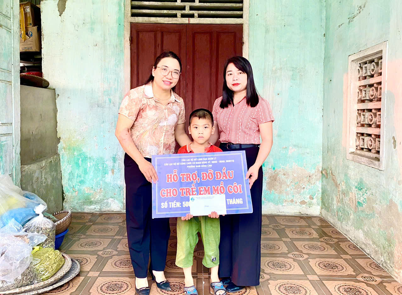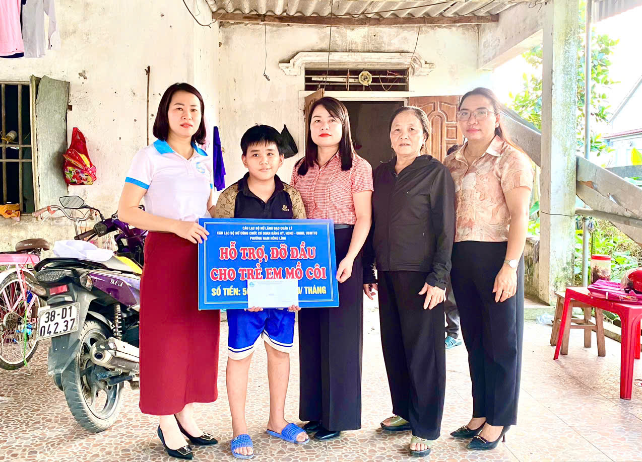 Theo đó, đoàn công tác đã trực tiếp đến từng gia đình, ân cần thăm hỏi, chia sẻ và trao hỗ trợ đỡ đầu cho 03 em nhỏ có hoàn cảnh đặc biệt khó khăn: Em Nguyễn Trung Hiếu (sinh năm 2012, TDP Thuận Sơn) mồ côi mẹ; bố bị tai nạn, hiện sống cùng ông bà nội đã cao tuổi, gia đình thuộc diện hộ nghèo. Em được Câu lạc bộ nữ lãnh đạo, quản lý nhận đỡ đầu với mức hỗ trợ 500.000 đồng/tháng trong 3 năm