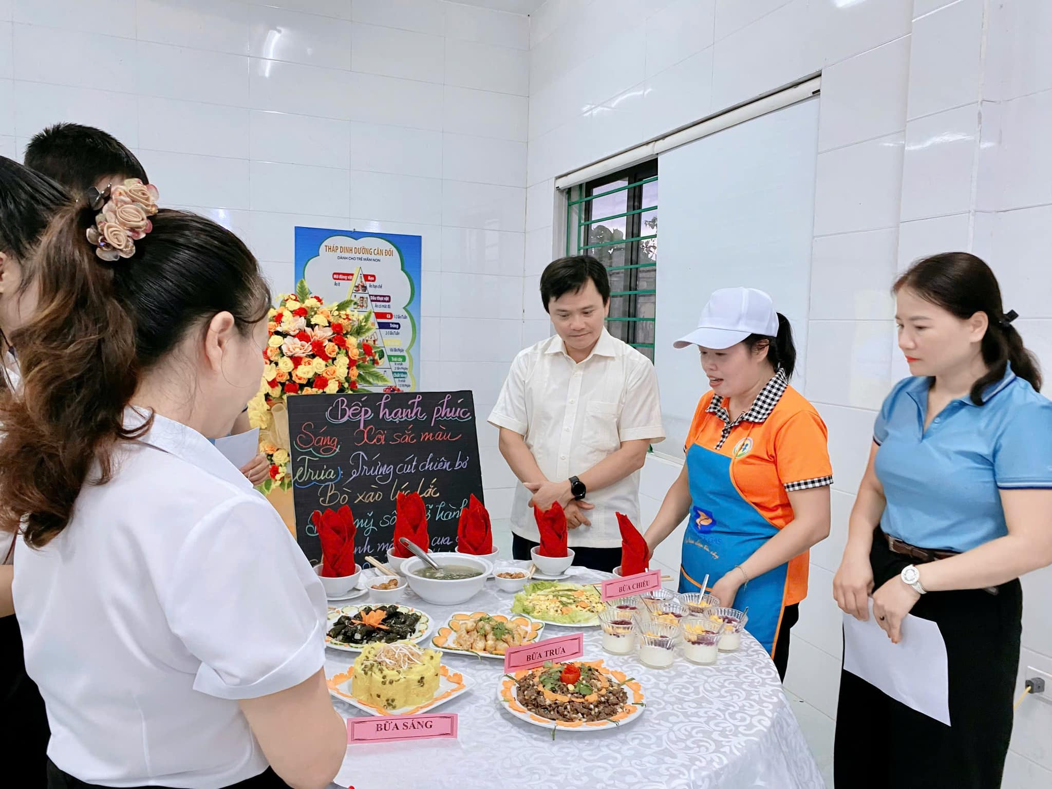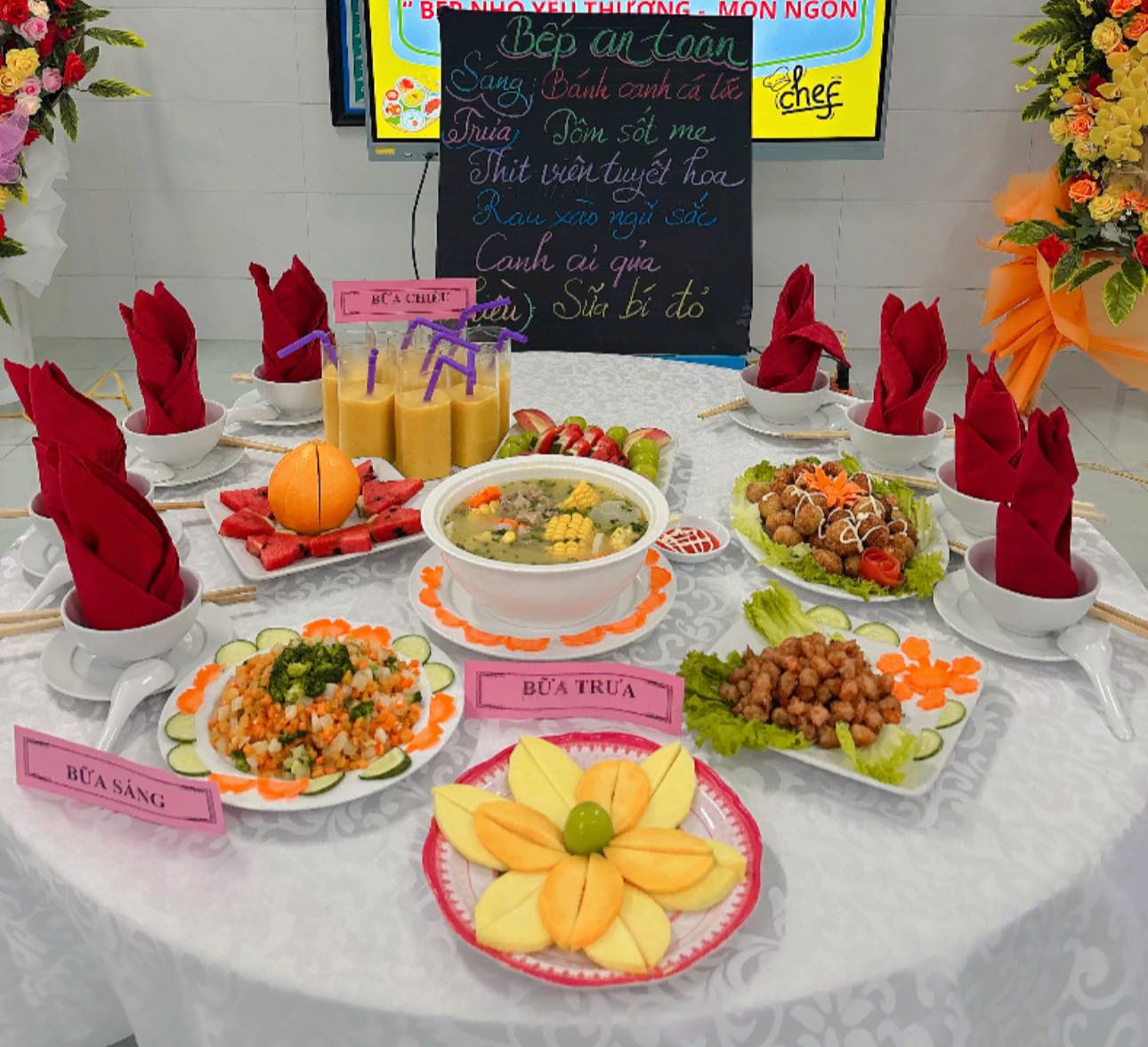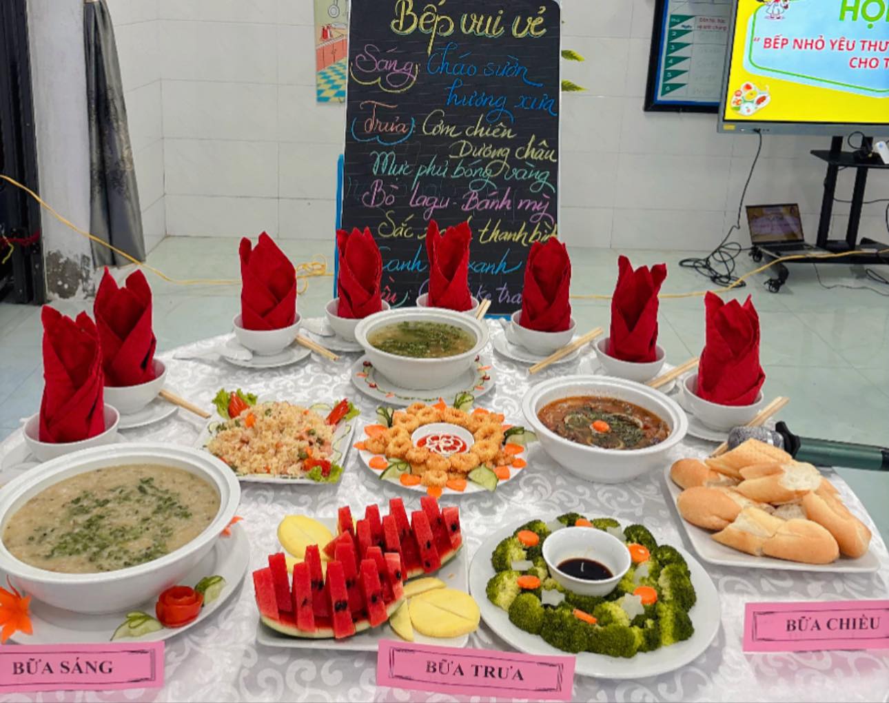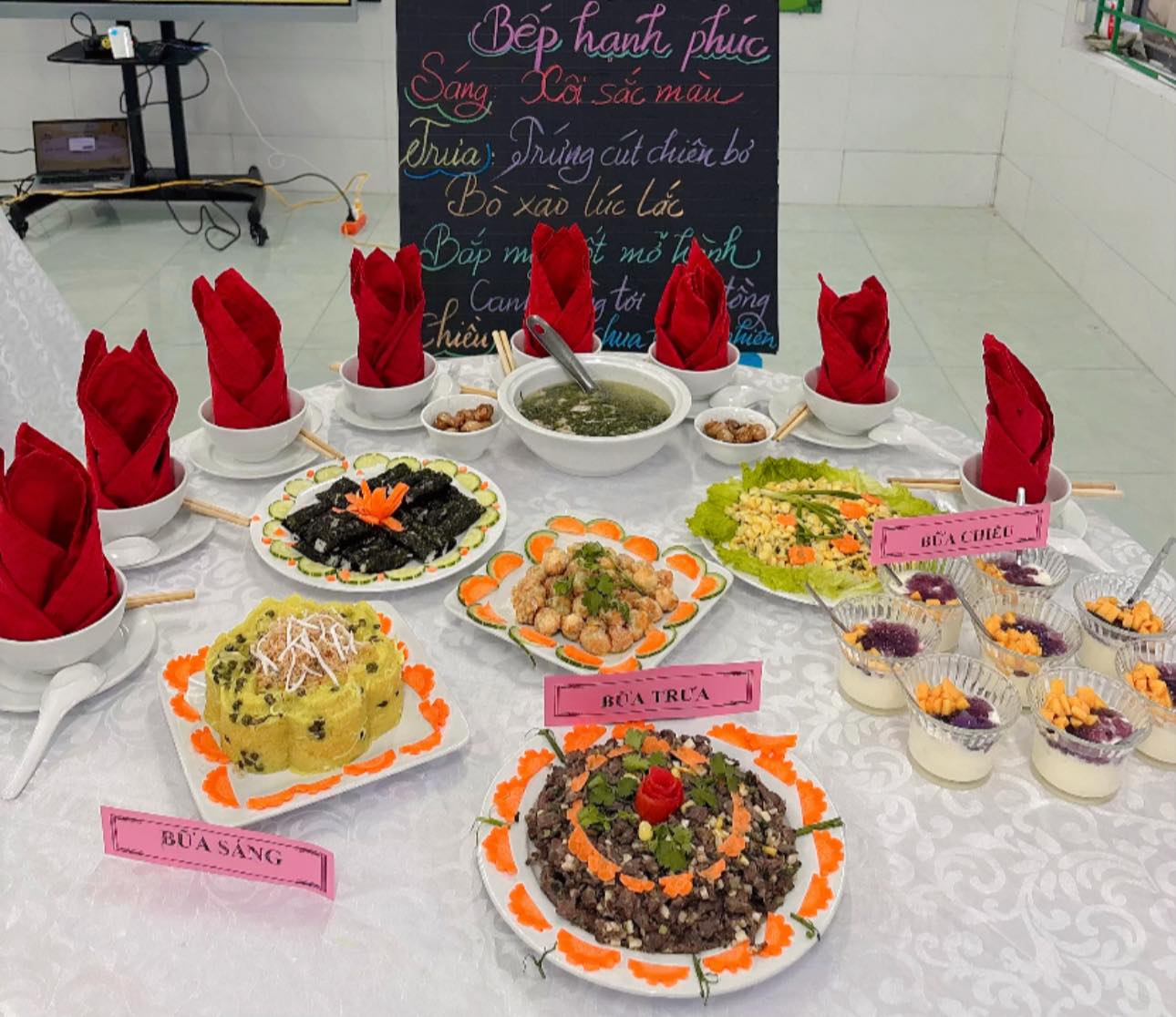 Hội thi gồm hai phần chính: Thi nấu ăn và trình bày mâm cơm. Từ những đôi tay khéo léo và trái tim đầy yêu thương, các cô đã chế biến nên những món ăn không chỉ thơm ngon, bổ dưỡng mà còn chứa đựng cả sự chăm chút, quan tâm dành cho từng bữa ăn của trẻ. Mỗi mâm cơm được trình bày là một “bức tranh” sinh động, mang đậm hương vị gia đình, gợi cảm giác ấm áp và gần gũi.