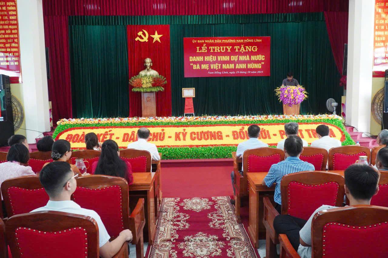 Thực hiện Quyết định số 1809/QĐ-CTN ngày 16/9/2025 của Chủ tịch nước Cộng hoà xã hội chủ nghĩa Việt Nam về việc truy tặng danh hiệu vinh dự nhà nước “Bà mẹ Việt Nam anh hùng”, sáng nay 19/10, Ủy ban nhân dân phường Nam Hồng Lĩnh tổ chức Lễ truy tặng danh hiệu vinh dự Nhà nước “Bà Mẹ Việt Nam anh hùng” cho mẹ Lâm Thị Em, quê quán xã Kim Song Trường huyện Can Lộc, tỉnh Hà Tĩnh (nay xã Trường Lưu, tỉnh Hà Tĩnh).