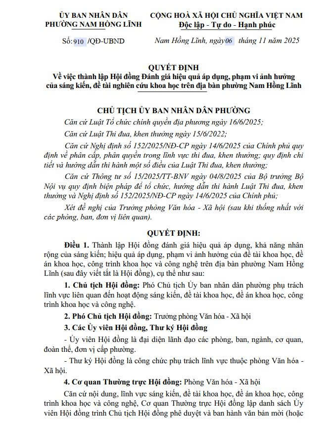 Ngày 6/11/2025 UBND phường Nam Hồng Lĩnh ban hanh quyết định số 910/QĐ-UBND về thành lập Hội đồng Đánh giá hiệu quả áp dụng, phạm vi ảnh hưởng của sáng kiến, đề tài nghiên cứu khoa học trên địa bàn phường Nam Hồng Lĩnh.